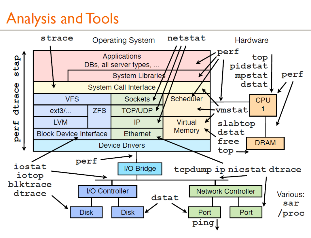高级的命令如下:sar、netstat、pidstat、strace、tcpdump、blktrace、iotop、slabtop、sysctl、/proc。