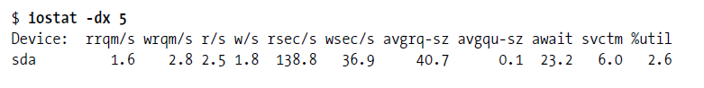 常见 linux 的磁盘 IO 指标的缩写习惯:rq 是 request,r 是 read,w 是 write,qu 是 queue,sz 是 size,a 是 verage,tm 是 time,svc 是 service。