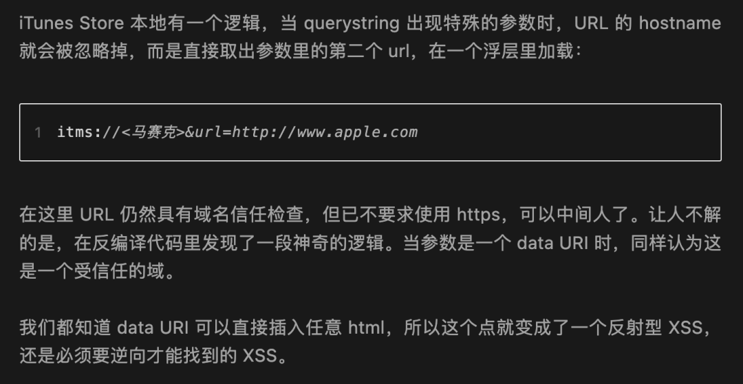 http://@www.apple.com:@www.hacker.comCoreFoundation 和 WebKit 解析 URL host 的逻辑存在差异。校验白名单的业务逻辑认为这是一个合法的域名(www.apple.com);传给 WebView 之后,WebKit 却载入了 www.hacker.com。