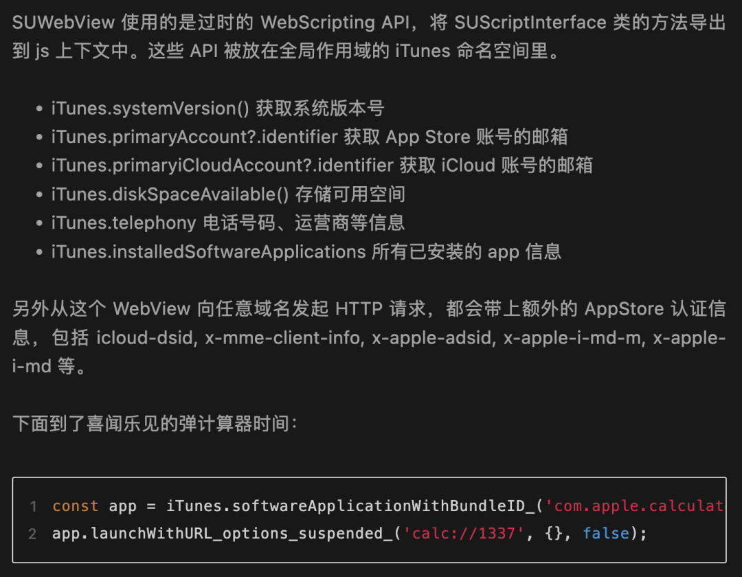 然而枚举已安装应用(某些想提权的 app 大喜),获取 iCloud 账户名,甚至任意域名发送鉴权 HTTP header 的问题都还在。关于这个 WebView 请求任意网址都会带上 Apple ID token 信息的问题,能不能用来访问 iCloud,我对那边的协议不熟,至今没有定论。大概率是不行。