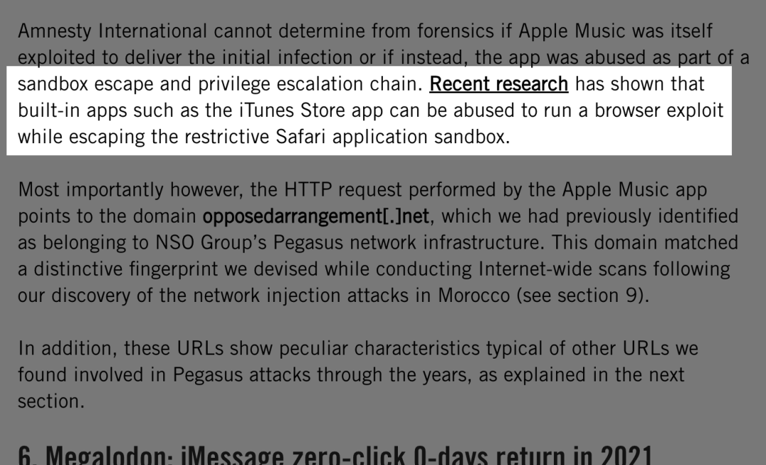 前年 FORCEDENTRY 完整样本还没出来,有一些基于设备日志的分析,观测到 Pegasus 有启动 Music 应用访问 URL 的行为。那个 Recent research 的链接特么引用的是我之前关于 iTunes Store 研究的文章,猜测 Pegasus 有可能利用了系统 App 做提权。