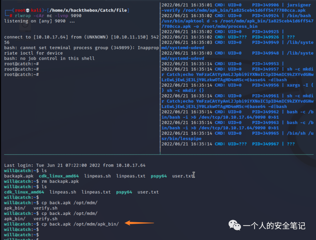 通过查看环境变量得到 will 用户密码,成功完成横向移动并逃逸出了 Docker 容器。最终通过监听计划任务分析执行脚本,完成命令注入拿到 root 交互 shell。
