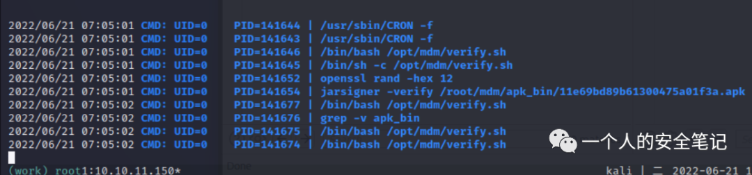 考虑存在计划任务执行,将 pspy 传递至目标服务器运行监听。果然和预想的一样,root 用户通过计划任务执行了该脚本。