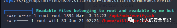 将 linpeas 脚本传递到目标服务器上运行,发现有个可疑的 verify.sh 脚本,我们对它具备读取和执行权限。
