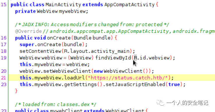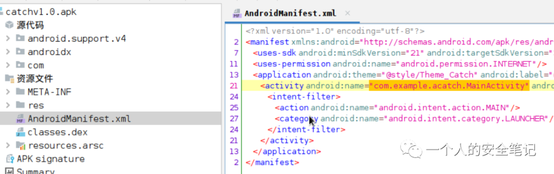 从中可以看到声明的可视化界面 Activity 的命名空间:com.example.acatch.MainActivity。直接去源代码去找 MainActivity 类,在里面的视图实现代码中得到一个域名,但没什么用。