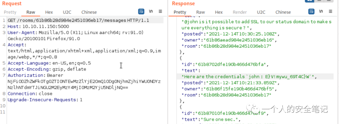 $ ffuf -w ./SecLists/Discovery/Web-Content/directory-list-2.3-medium.txt -u http://10.10.11.150:5000/rooms/61b86b28d984e2451036eb17/FUZZ -H "Authorization: Bearer NjFiODZhZWFkOTg0ZTI0NTEwMzZlYjE2OmQ1ODg0NjhmZjhiYWU0NDYzNzlhNTdmYTJiNGU2M2EyMzY4MjI0MzM2YjU5NDljNQ==" -fc 404,400可以看到,当请求 /messages 时存在多行字符串结果显示。随后请求这个路径,从结果中看到一组凭证信息。