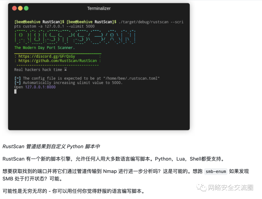 现代端口扫描仪。快速查找端口(最快3秒)。通过我们的脚本引擎运行脚本(支持 Python、Lua、Shell)。