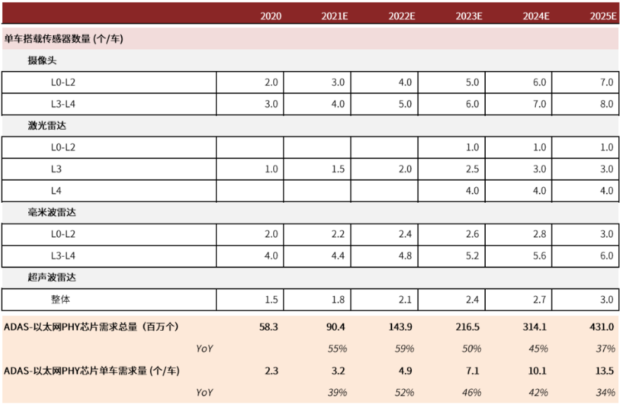 CAN总线作为车内成熟的通信总线,已经在国内外所有车型上广泛使用,据中国汽车工业协会统计分析,2019年我国汽车产量完成了2572万辆,国内汽车上的CAN通讯芯片就有将近30亿元的市场。目前,按国内每年2500万辆计算,CAN芯片需求量在12.5亿颗,按全球汽车9000万辆,全球车载移动终端需要CAN芯片数量保守超过45亿颗。在国内汽车市场,LIN芯片(包含单、多路)的年使用量大概在一亿颗,每年用量的增长CAGR大概在13%左右。CAN/LIN SBC芯片大约占CAN/LIN总市场的10%,NXP在这个产品分支依然是垄断地位,其他厂商如TI、Microchip正在逐步提升市占率。市场上主要CAN/LIN芯片供应商是NXP、德州仪器、英飞凌、瑞萨、意法半导体和安森美等国外公司,国内包括北京君正、芯力特等。NXP占据全球市场垄断地位,在近年来的缺货影响下,TI和安森美采用价格策略,分走了NXP的部分中小型企业的份额,市占率有所提升。目前FlexRay总线芯片主要由NXP、瑞萨垄断,其中NXP占据了全球90%的FlexRay总线收发器市场份额。由于各种技术原因和成本高昂,FlexRay在全球普及率并不高,目前的主要观点为:车规以太网可能会取代 FlexRay。因此,本书中对FlexRay芯片及其使用、市场不进行展开描述。MOST发射和接收模块主要供应商包括 Infineon等;MOST控制器芯片主要供应商为 Oasis Silicon Systems。由于各种技术和成本原因,MOST在全球普及率并不高,目前的主要观点为:车规以太网可以会取代MOST技术。因此,本书中对MOST芯片及其使用、市场不进行展开描述。智能汽车渗透率提升叠加汽车对网络速度要求倍数增长(百兆正在被千兆取代,而千兆将被2.5G/5G/10G取代),以太网芯片有望迎来量价齐升的局面,从车载以太网的渗透率来看,2020年渗透率约为10%,考虑到自动驾驶对车载以太网的需求方面,到 2030年L3级别以上的自动驾驶车辆将以车载以太网技术为主,渗透率有望达到50%。整体来看,包含了PHY芯片和交换芯片的国内车载以太网芯片市场的规模将从2020年的23亿元增长至2025年的293亿元,对应2020-25E期间66%的CAGR。考虑到远期在ADAS、IVI系统中主要使用的是1G及以上的PHY芯片,未来随着高速率PHY芯片占比的逐步提升,预计2025年,国内的车用PHY芯片市场规模有望达到156亿元,相较于2020年的12亿元体量,对应66%的CAGR,市场空间充沛,潜力较大。根据当前市场车载以太网Switch交换芯片市场情况,假设车载交换芯片均采用4口(即单车需求量为PHY芯片的1/4),在批发采购条件下,其ASP约为70元/个;高速率产品占比的提升将带动其ASP在2021-25E年均增长10%。预计国内的车载以太网交换芯片市场规模将在2025年达到137亿元。竞争格局方面,PHY芯片技术门槛非常高,芯片设计时需要数模混合,既包含了高速ADC/DAC、高精度PLL等模拟设计,也需要滤波算法和信号恢复的DSP设计能力,目前全球仅NXP、博通、Marvell、瑞昱、Microchip、德州仪器六家供应商能够实现量产。国内方面,华为已率先投资国内为数不多致力于以太网芯片研发的企业裕太微电子,该公司选择汽车领域这一全新以太网PHY芯片应用场景作为着重发力点已初具成效,2020年车载100Base-T1PHY芯片在经过各项车载测试验证后,已成功导入到各大国内知名车厂平台,公司目前正大力研发下一代车载PHY芯片,其中1000Base-T1PHY预计将在2022年对接到下游厂商当中。以太网Switch交换芯片方面,主要有Marvell、博通和NXP。Microchip收购的Micrel和台湾瑞昱也有一席之地。PHY芯片在IVI信息娱乐系统中部署于导航系统的功放、T-box等无线模块中,以及娱乐信息显示屏中。假设以太网在前装导航系统和娱乐显示屏的渗透率分别从2020年的5%/20%增长到2025年的50%/80%。最终预计IVI系统中单车的PHY芯片用量将从2020年的0.2个/车增长至2025年1.7个/车,国内市场需求总量将达到0.54亿个。未来车载通信网络的发展趋势包括了减少线束和提高通信带宽,现有的车载总线技术尽管可以提供简单网络架构,但通信带宽和实时性满足不了未来汽车的智能网联化需求。在现有的车载网络中,为了实现更高带宽,通常将多个总线网络连接到网关设备,然后由网关进行转发处理,这样实际造成了线束成本和车身质量的增加;同时,随着车载网络业务升级,需要承载的业务数据种类也越来越多,低速和高速总线数据,以及与以太网数据的融合,对于车载通信网络提出更高带宽以及更精确的时间敏感特性需求。基于时间敏感技术的宽带现场总线AUTBUS标准,是中国自2008年以来在工业通信网络IEC 61158国际标准体系唯一成功立项的国际标准,符合全球工业网络对先进通信技术的数据融合预期,既具有总线网络简单可靠维护方便的优点,也具有实时以太网高带宽高实时性的优势,已经吸引了部分国际厂商的关注与跟进,并具有完全自主可控优势。目前东土科技已经完成了宽带现场总线AUTBUS芯片KY3001系列的批量生产,并正在积极推动AEC-Q100和ISO 26262相关认证。。通过引入AUTBUS芯片,可以实现与现有车载通信网络的无缝连接,很容易实现与其他总线以及车载以太网数据的共网传输,有效降低车载网络线缆成本,提高了通信带宽,也增强了车载网络的业务处理能力,同时AUTBUS通信机制采用了具有纠错容错功能的编解码方案,进一步提高可通信网络的抗干扰能力,并支持可定制的加密功能,对车载网络中关键数据传输提供安全通信保障。汽车上用的视频传输芯片,主要用于连接摄像头和SOC,以及屏幕和SOC。因此,