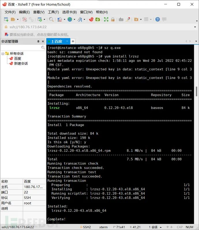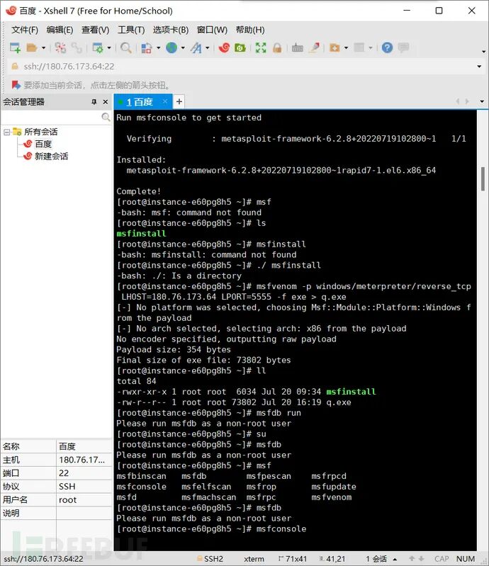 连接云服务器,并下载msf:curl https://raw.githubusercontent.com/rapid7/metasploit-omnibus/master/config/templates/metasploit-framework-wrappers/msfupdate.erb > msfinstall && chmod 755 msfinstall && ./msfinstall