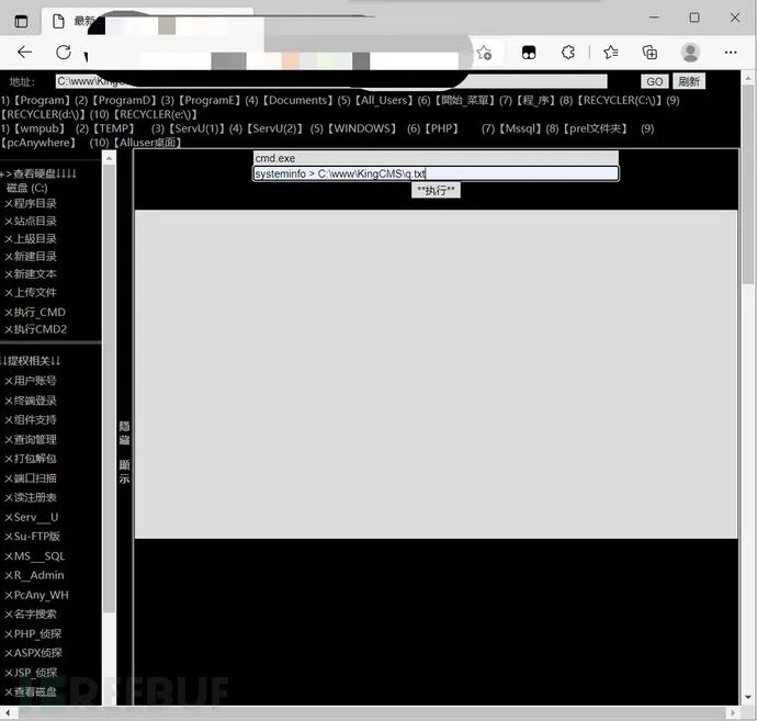 用大马生成文件:systeminfo > C:\www\KingCMS\q.txt