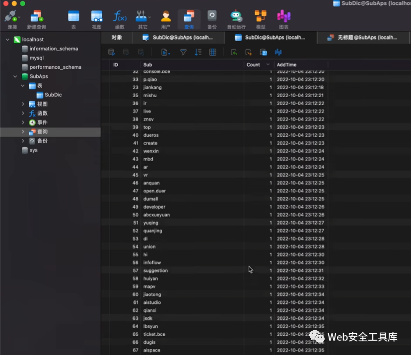 0x01 工具介绍SubAps是新一代子域嗅探工具,可以全网爬虫获取子域,以数据库作为字典进行计次,提高准确率和效率。0x02 安装与使用1、主动扫描指的是通过从数据库读取Topxx(指定)数量的字域
