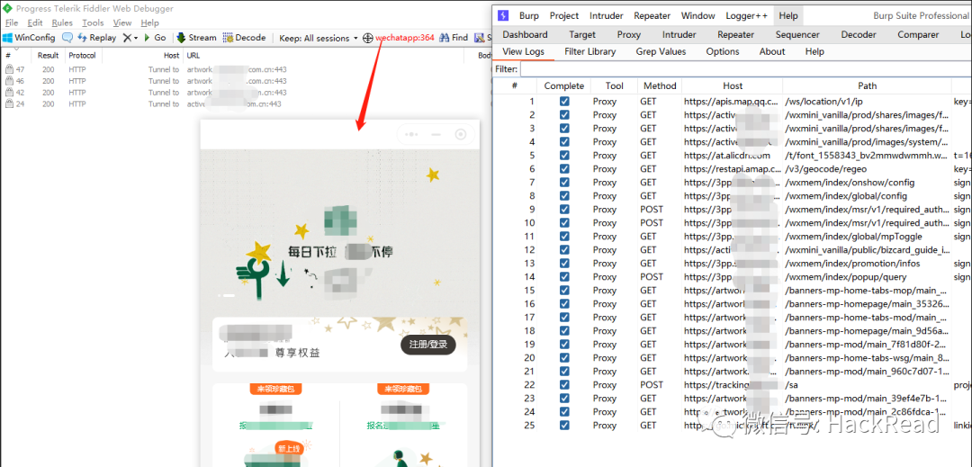 PC端微信小程序抓包:Fiddler设置系统代理,并将网关代理设置为burp的127代理+Burp Suite的logger++插件记录流量。