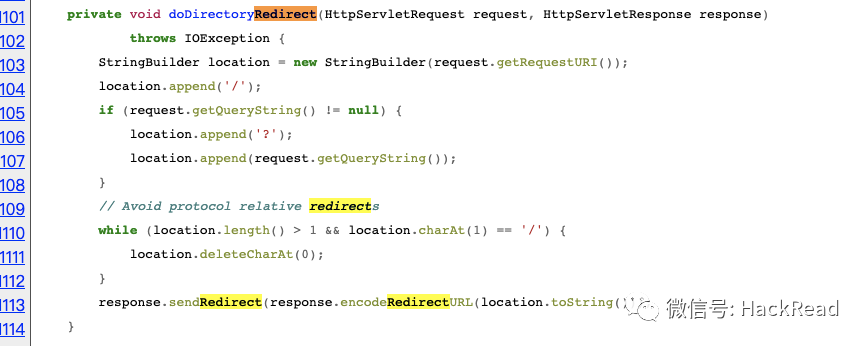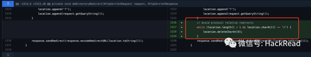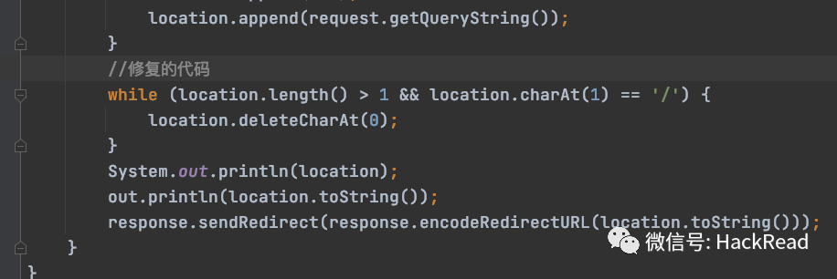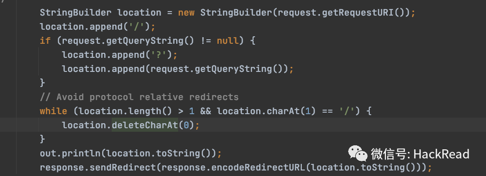 // Avoid protocol relative redirectswhile (location.length() > 1 && location.charAt(1) == '/') {location.deleteCharAt(0);}