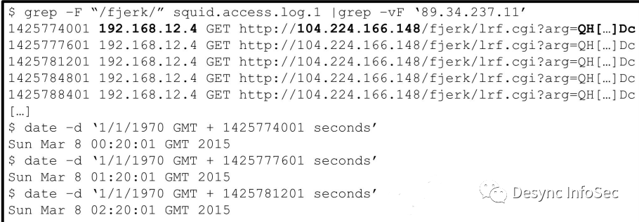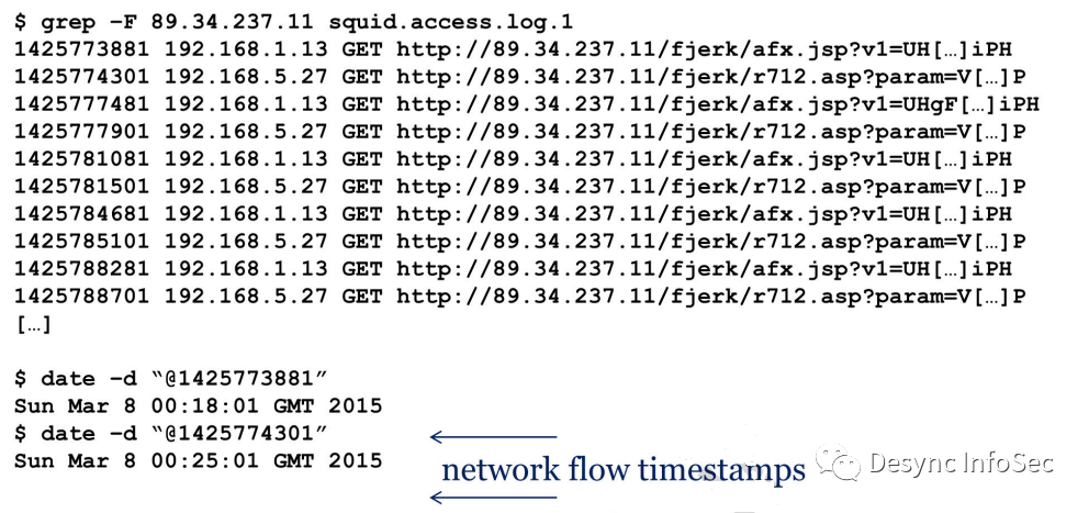 现在我们在与netflow日志同一时间的Squid日志中搜索C2服务器IP的信息,我们发现在同一时刻,是内网的两台主机在请求C2服务器IP的HTTP资源,这也印证了我们之前猜想的第二种可能。