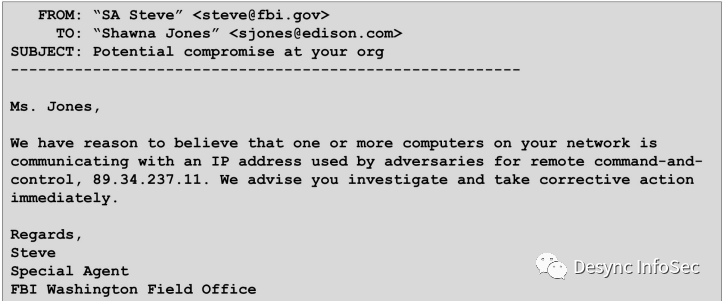 现在让我们通过一个案例来学习情报分析的流程。某一天,身为Edison公司威胁分析师的你收到了来自FBI的一封邮件,他们声称你的企业网络中某些计算机与一个C2服务器IP建立了网络连接,需要进行排查。