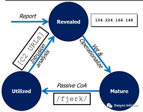 至此我们从通报中的C2服务器IP成功发现了一些可能存在问题的内网主机,我们来观察一下这个过程中情报的生命周期。首先我们从外部通告中得到了一个IoC:89.23.237.11,我们使用这个IoC在netflow日志和squid日志进行检索,定位到了疑似失陷的内网主机,此时情报进入成熟状态(Mature),我们通过检索出的URL,提取到新的特征"/fjerk/",扩展了已经掌握的情报并再次进行检索,此时情报为工具化状态(Utilized),通过扩展的IoC,我们又发现了新的C2服务器IP:104.224.166.148,这个新的IoC重新回归初始纰漏状态(Revealed),我们需要再使用这个IoC进行检索,以便发现新的失陷主机。