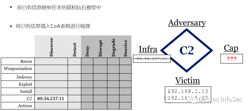 现在我们使用之前提到过的杀伤链、钻石模型和CoA矩阵对已有数据进行整理。我们已经知道有2台内网主机在外联攻击者的C2服务器基础设施,这已经属于远程控制阶段。我们也通过CoA的发现Discovery验证了C2服务器IP的情报,