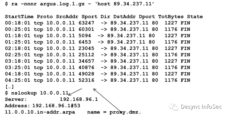 现在,我们通过申请授权,已经拿到了当前网络中最近7天的netflow日志,他们是网络工程师收集和整理的,每个gz包以24小时的范围进行打包。我们可以直接使用argus工具分析这些压缩包内的数据。我们在日志中搜索通报中的C2服务器IP,发现10.0.0.11这个内网IP与C2服务器IP发生过通信行为。根据目的端口80,我们假设这个C2服务器的恶意载荷是以HTTP协议作为隧道进行通信的。从时间上看,每小时的第18分钟和第25分钟会发起连接。从经验证看可能是恶意软件的心跳通信机制,或者恶意软件创建系统计划任务规律性执行。