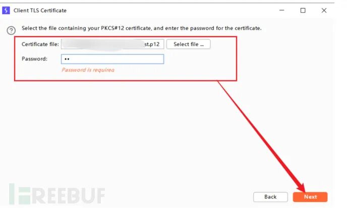 在burp导入网站客户端xx.p12证书的会提示要求输入密码,如果我们知道密码当然就直接输入,