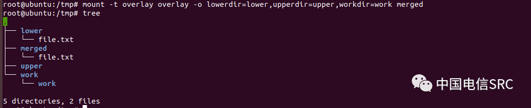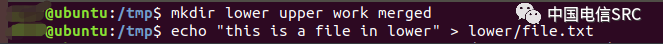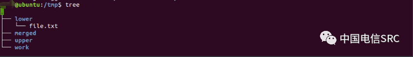 什么意思呢,做个实验:创建个基本的overlay文件结构,lower upper work merged文件夹,并创建一个文件在lower层file.txt。