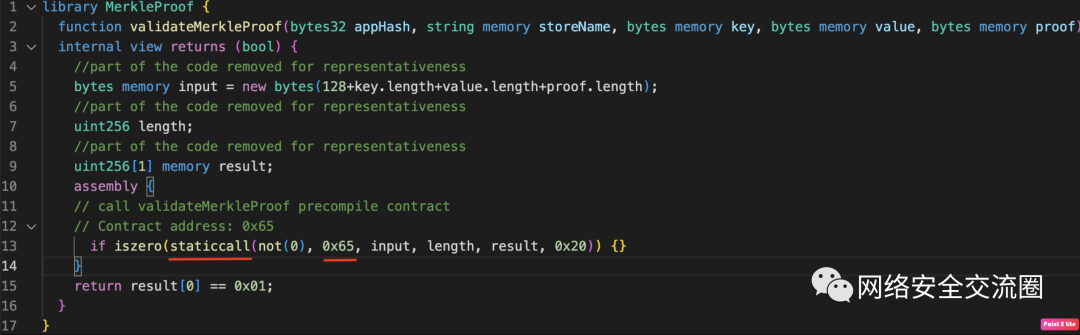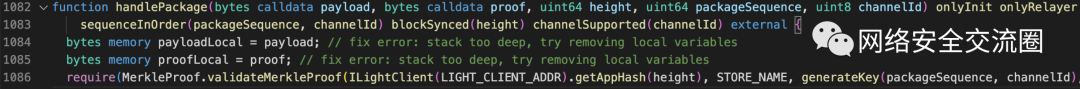 handlePackage函数中调用了MerkleProof库validateMerkleProof的函数;使用0x65处的方法,调用预编译的合约。该合约是一个用 Go 编写的库,它具有许多实现 Merkle 证明功能的 Cosmos 跨链框架的依赖项(方法)。staticcalliavlMerkleProofValidate