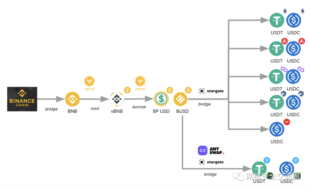 接下来,由于担心BSC中的资产被冻结和封锁,攻击者开始从桥上提款。为了洗钱,他们使用了Venus Finance DeFi:他们发行了包装好的vBNB代币来换取BNB,并使用vBNB作为抵押品借出了币安的稳定币BUSD。接下来,攻击者使用 Stargate 和 Anyswap 桥将 BUSD 转换为多个区块链中的 USDT 和 USDC 稳定币:Ethereum、Avalanche、Fantom、Polygon、Arbitrum 和 Optimism。