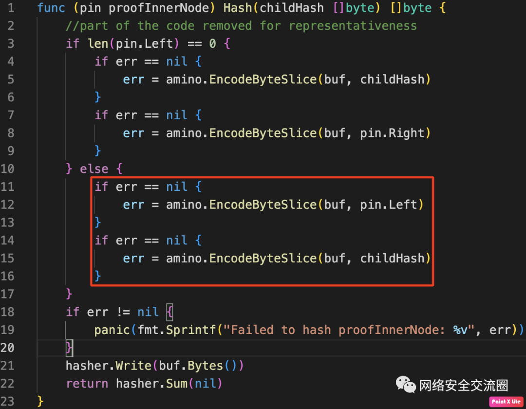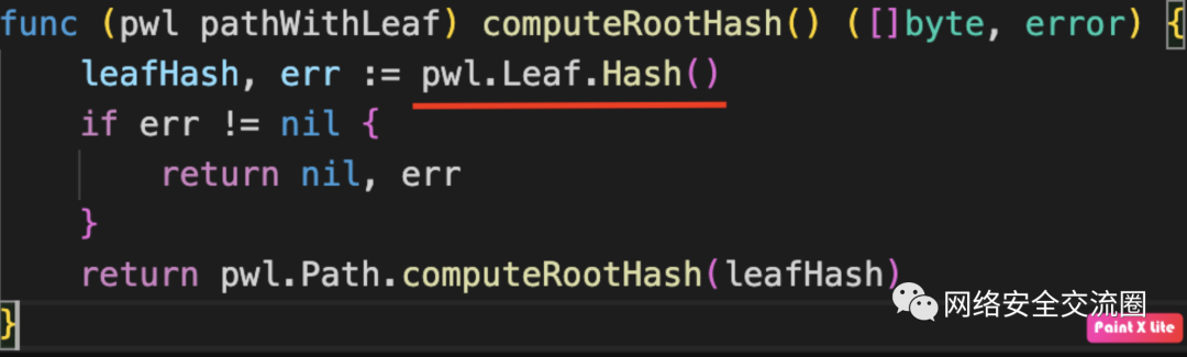 交易验证过程的漏洞与计算和检查交易的树根哈希的方式有关。该ComputeRootHash函数调用该pwl.Leaf.Hash()方法: