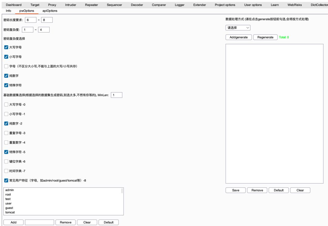 一款BurpSuite插件,主要是解决我日常爆破时字典的需要,收集的字典数据太多了,有时想要指定特征的爆破字典就要自己手撸, 所以就想着写个插件了,可以自己通过配置生成字典了, 未来会持续写,把日常可能使用到的都实现了,主要是太懒了。