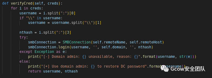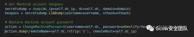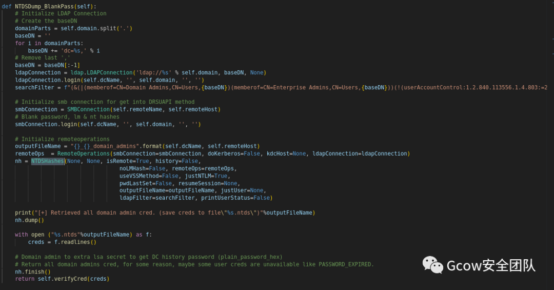 • 3、第三步,我们到这里就需要开始用DC空密码机器账户做DCSync,这一步也没什么讲的,我们从secretsdump.py里面学习,取我们需要的模块即可,主要就是这个NTDSDump模块