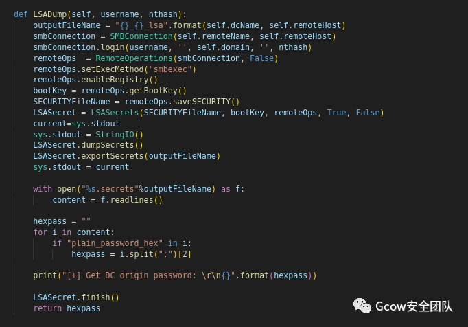 • 4、第四步,这时候我们要用上面获取到的域管凭据去做LSADump,导出security里面存储的机器账户密码(plain_password_hex),我们只需要用到impacket的LSASecrets模块