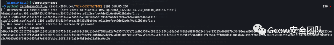 • 5、第五步:最后调用dirkjanm的还原密码脚本,使用上面排查过可用域管凭据+上面获取到的hex strings即可恢复DC机器账户的密码