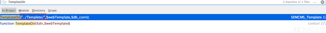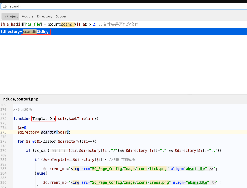 比如搜索scandir函数,该函数作用是列出指定路径中的文件和目录,目的是通过找到类似目录遍历漏洞的点,从而找到后台地址。