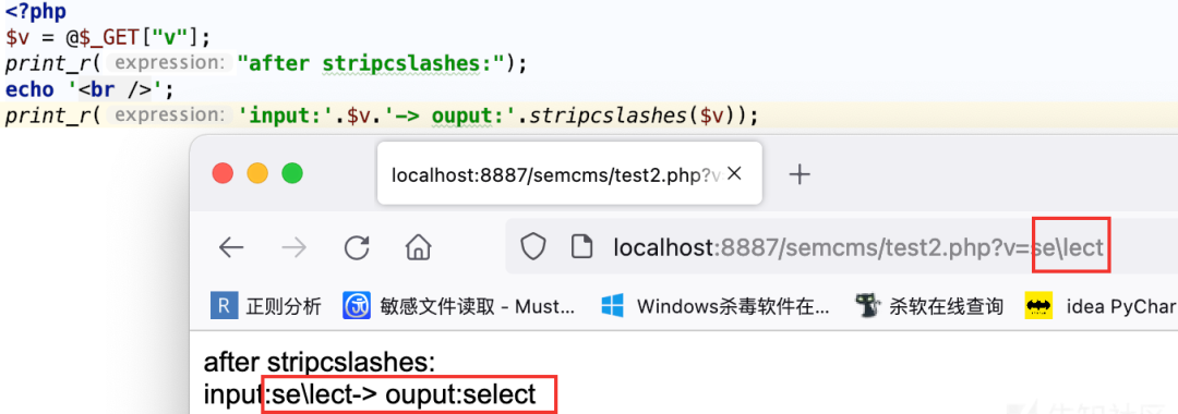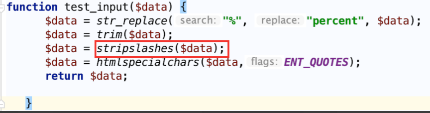 test_input里面有个有趣的函数stripslashes,函数的作用就是用于去除反斜杠,举个如图例子