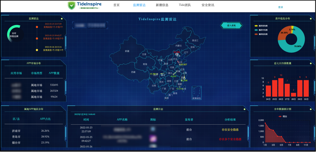 监测雷达: 将山东省各地市APP数据进行统计,例如APP分布、漏洞数量、漏洞等级和排名信息等,见图13。