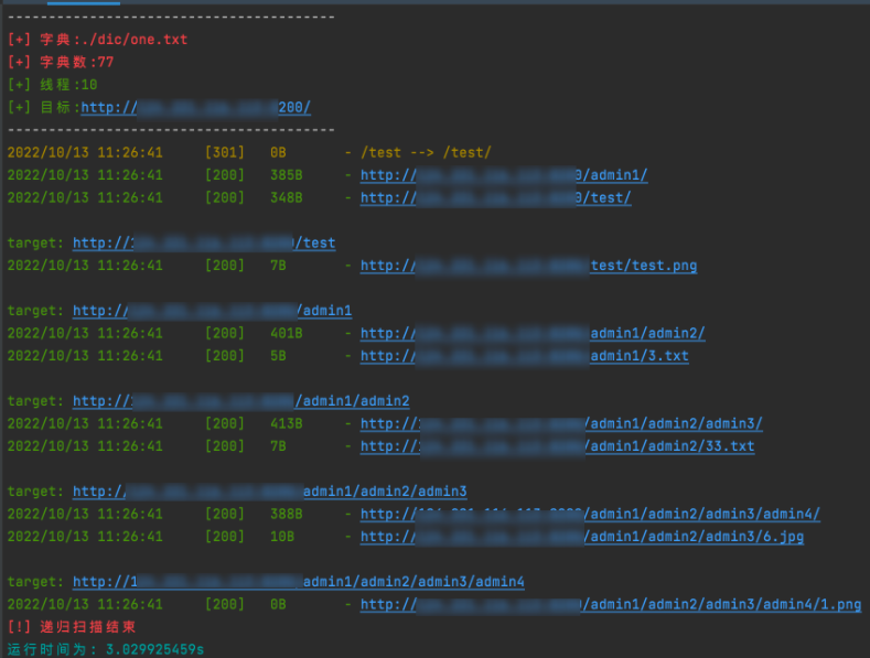 ./Dirscan -u http://xxx.xxx.xxx.xxx -r -i 200 默认对状态码200,301,302,403的目录进行递归扫描,字典没有/admin1/admin2/admin3/admin4/1.png ,是递归扫描得出。