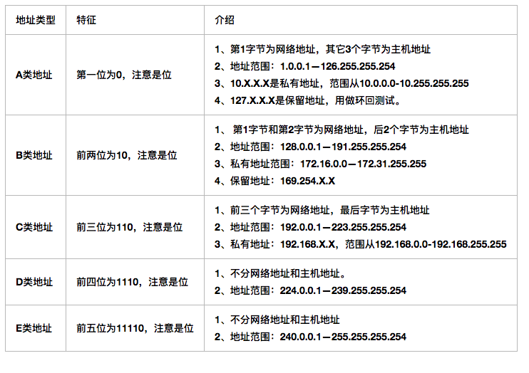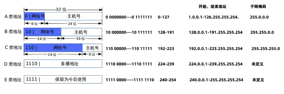 IPV4 的 IP 地址在 1993 年时采用了 “分级式定址”,将 IP 地址分为 A、B、C、D、E 五个类别,每个类别的地址都是由它们的前 3 位来标识。A 类一般用于政府、B 类一般用于公司、C 类一般用于共用、D 类一般用于主播、E 类一般用于实验。