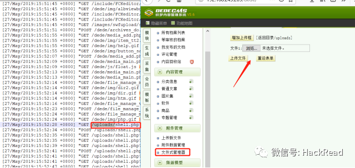 经测试发现在网站后台“文件式管理器”处可以上传任意php文件,所以入侵者就直接上传了shell.php大马