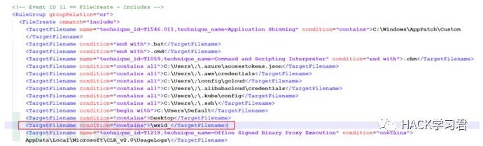 文件落地的监控,我们需要依赖于SYSMON或者其他EDR系统来进行,本文为了统一性,仅采用SYSMON作为阐述的工具,在这里,我们就需要利用到SYSMON的事件来进行监控,在Sysmon事件ID 11 (FileCreate)中,当创建或覆盖文件时,会记录文件的创建和创建文件的进程的信息。这个事件对于监视启动文件夹、临时目录和下载目录等位置非常重要,这些位置通常是恶意软件在初始感染期间放置的地方。(关于具体如何使用SYSMON,本文不再赘述,请自行查阅相关文档)为了针对微信文件传输进行监控,我们还需要在配置文件中添加监控标签,因为微信存储在WINDOWS中的路径由用户属性组成,所以,这里仅需记录“wxid_”就已经足够。