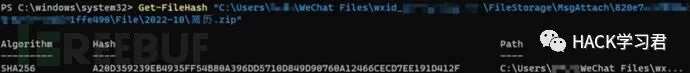 Get-FileHash "C:\Users\XXX\WeChat Files\wxid_XXXX\FileStorage\MsgAttach\820e7XXXXXXXXXfe490\File\2022-10\简历.zip"