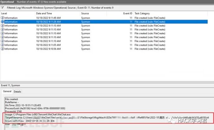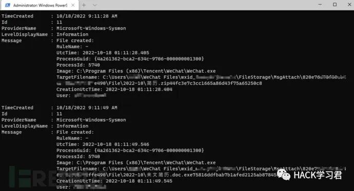 Get-WinEvent -LogName 'Microsoft-Windows-Sysmon/Operational' -FilterXPath "*[System[(EventID=11)]]" -Oldest -MaxEvents 10 | Select-Object TimeCreated, ID, ProviderName, LevelDisplayName, Message | where message -match 'wxid_' | Format-List