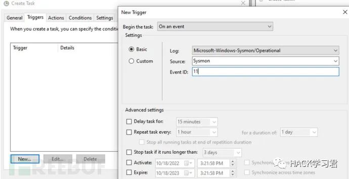 如果我们依然不具备集中管控平台,也没有办法进行日志集中化采集,其实我们也可以考虑在本地进行采集,过滤和提交,利用Windows本身自带的任务计划程序,我们亦可以通过触发SYSMON的文件写入条件来执行Powershell或者其他脚本命令,后续大家可以执行扩展一下。