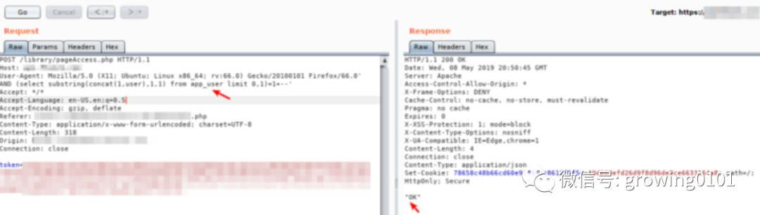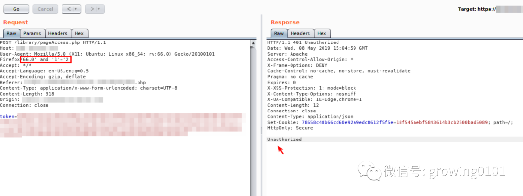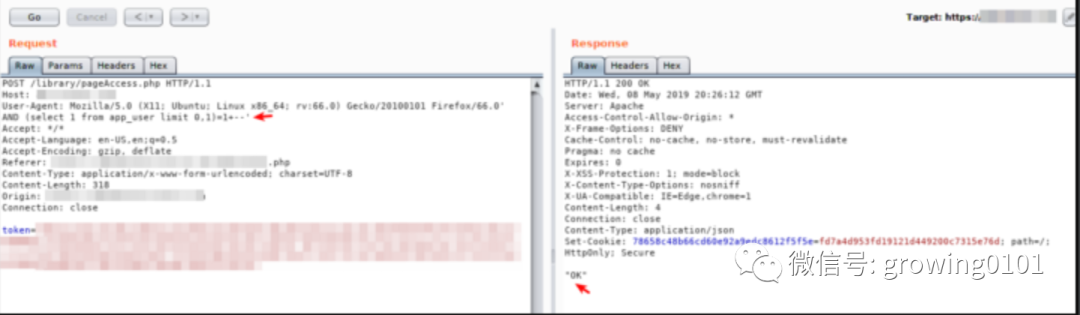 下面尝试测试,一开始响应中总是返回OK,在User-Agent Header中加了一个单引号',结果返回401: