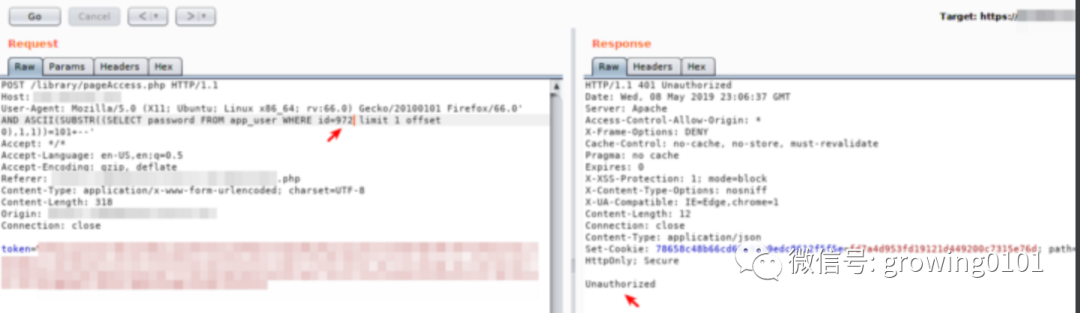 payload为' AND ' 1 ' = ' 2的时候,返回401;