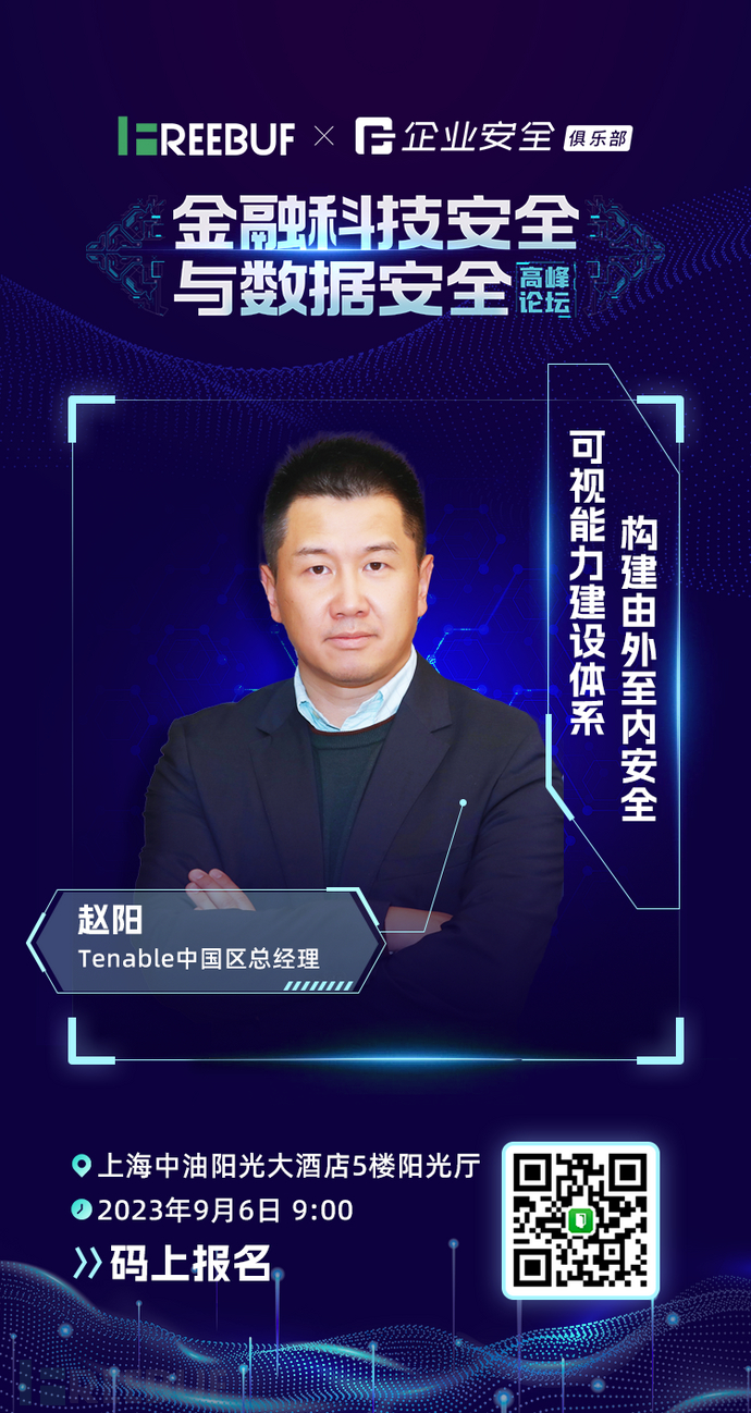 在即将于2023 年 9 月6 日举办的FreeBuf 企业安全俱乐部·上海站现场,我们也将邀请到Tenable中国区总经理赵阳,以“构建由外至内安全可视能力建设体系”为议题,解读企业在断变化的风险前的应对解决之道。