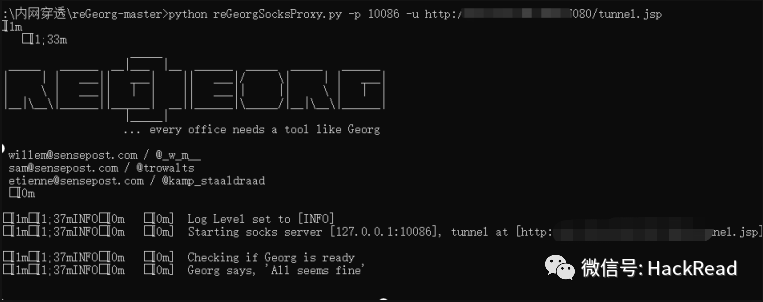 比如python reGeorgSocksProxy.py -p 10086 -u http://x.x.x.x/tunnel.jsp。