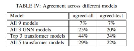 另外, 不同架构的DLM模型在测试结果上表现出了较低的一致性:因为只有7%的测试数据(和7%的总数据)被所有模型所认可。三个GNN模型仅在20%的测试示例(和25%的总数据)上达成了一致,而三个表现最佳的transformer模型(LineVul、PLBART和VulBERTa-CNN)在34%的测试数据(和44%的总数据)上达成了一 致。但是,当比较所有5个transformer模型时,只有22%的测试示例(和29%的总数据)是一致的(见表 IV)。不同模型之间的低一致性意味着:当没有基准标签时,跨模型比较性能的差异测试方法可能意 义非常有限。