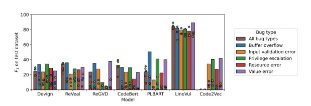 RQ2:是否存在某些类型的漏洞更容易被检测?是否应该为每种类型的漏洞建立单独模型,还是训练一个可以检测所有漏洞的模型?哪种方式训练出的模型性能更好呢?